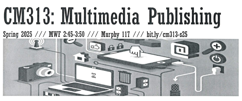 CM313 is a course I developed in order to better serve our Multimedia Publishing students. While fundamental principles in journalistic writing are supported by courses in the English department, there was a need for our media students to combine the forms and genres of writing for internet publication with basic media production and web design skills. The semester takes the form of a series of “draft sprints” in which students explore a single story through a range of different media. The final project asks them to revise their drafts into a single multimedia feature story, as well as collaborate with peers to stand up and launch a web publication.